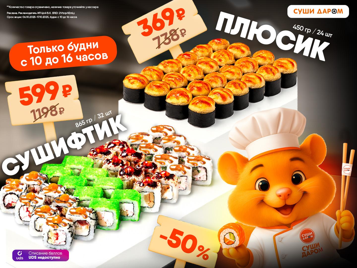[emoji=:heart_eyes:]Представляем вашему вниманию бомбические сеты "Сушифтик" и сет "Плюсик"[br]Созданы для того, чтобы твой обед был идеальным![br]Берёшь сытный Сушифтик — добавляешь лёгкий запеченный сет Плюсик.[br]И получаешь комбо, где вместе реально намного вкуснее [emoji=:yum:][br][br] Не пропусти - только по будням, только до 16:00[br][emoji=:orange_heart:] Сет Сушифтик — 0,8 кг всего за 599 ₽[br][emoji=:orange_heart:] Сет Плюсик — 450 г всего 369 ₽[br][br] Срок действия акции с 06.10.2025-17.10.2025 будние дни до 16:00[br]*Списание баллов UDS невозможно.[br]**Количество товара ограничено, наличие товара уточняйте у кассира по телефону 8 (952) 125-52-45